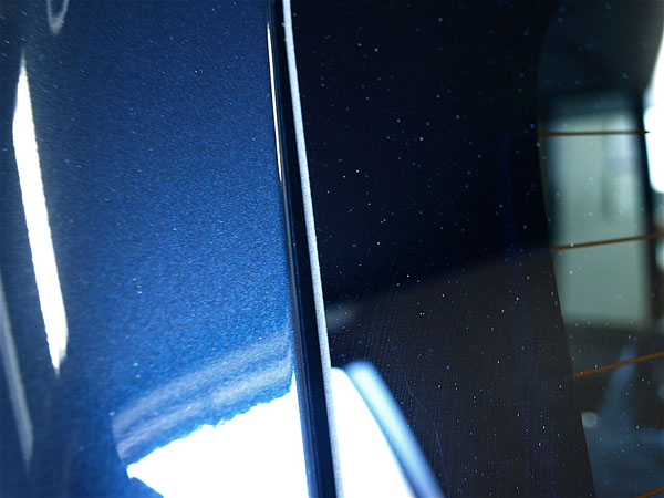 ご覧のように、ブラックのボディカラーに白又はグレーの塗料が付着しているのがお判り頂けると思います。このようにボディ全体に多量のペンキミストが付着しており、かなり目立っておりました。こちらは、リアガラスへの付着の様子がお判り頂けると思います。ガラス面で一番付着していたのが、このリアガラスでお車の後ろ側から降り注いだようです。お車の両側への付着よりも明らかにリア側の付着が多かったのでそのように予想されます。ご来店の前に、任意保険の担当者から『しっかりと除去してもらってください。その為の保険ですから』と心強いお言葉を頂いたそうですが、実際にお客様はそれ以降このお車に乗っていなかったそうです。そのお気持ち判ります。買って直ぐにこれですもの。悲しいですよね。
